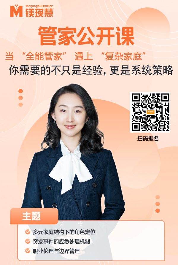 本次分享会将由镁瑛慧国际管家学院资深导师团队领衔,结合多年一线服务经验与国际标准体系,深入剖析真实案例,系统梳理职业管家在复杂家庭场景中所面临的典型挑战,并提供可落地的应对策略。内容涵盖: